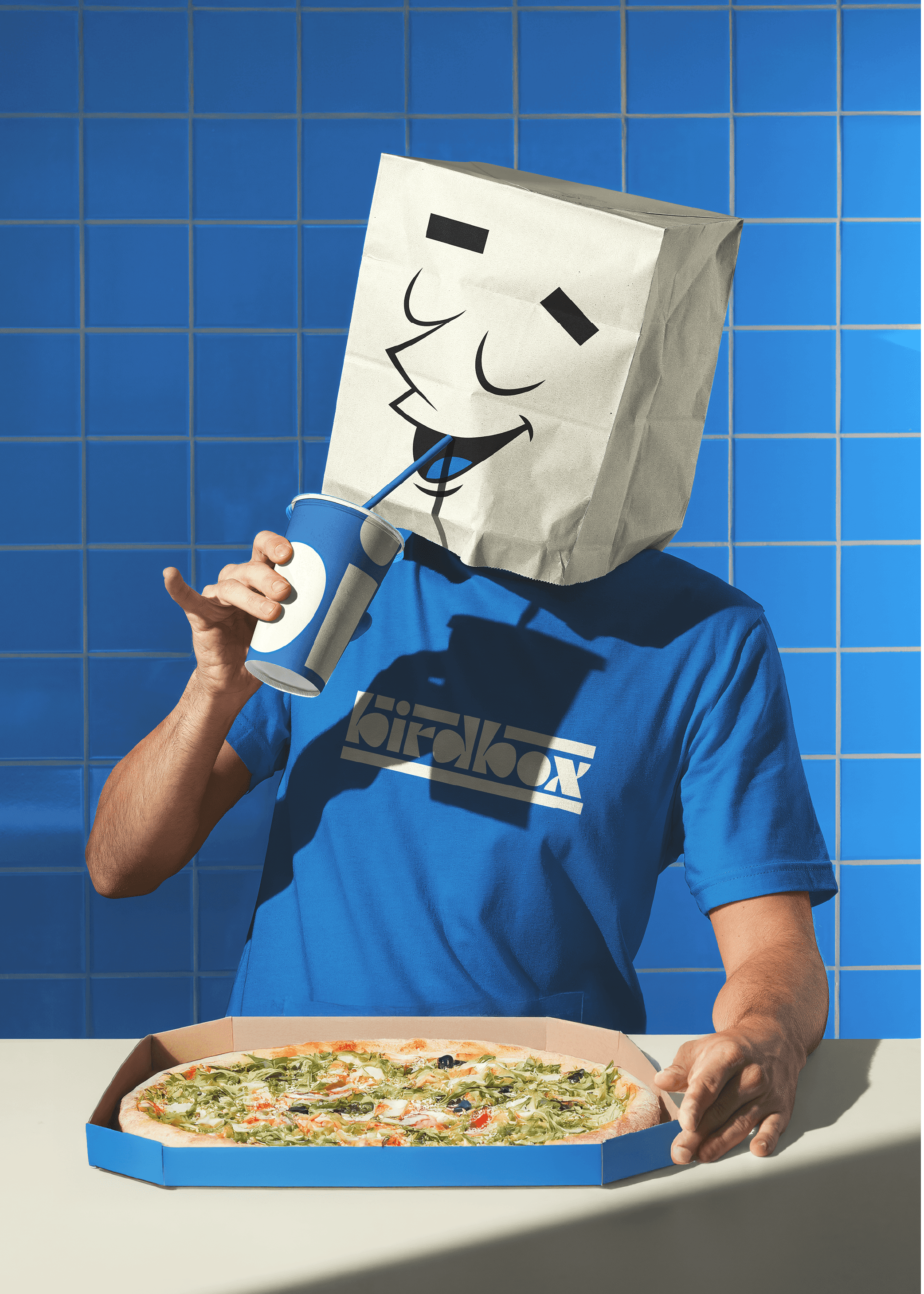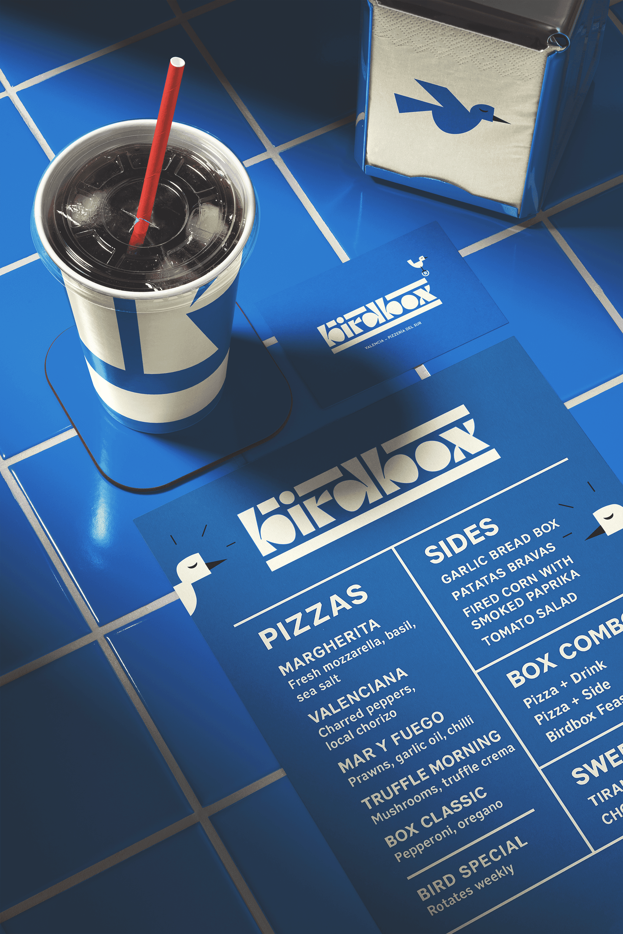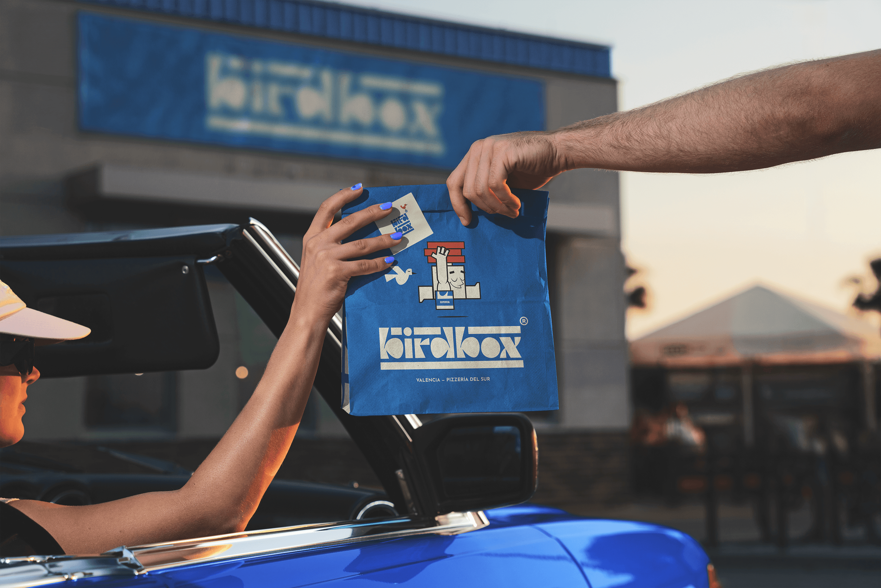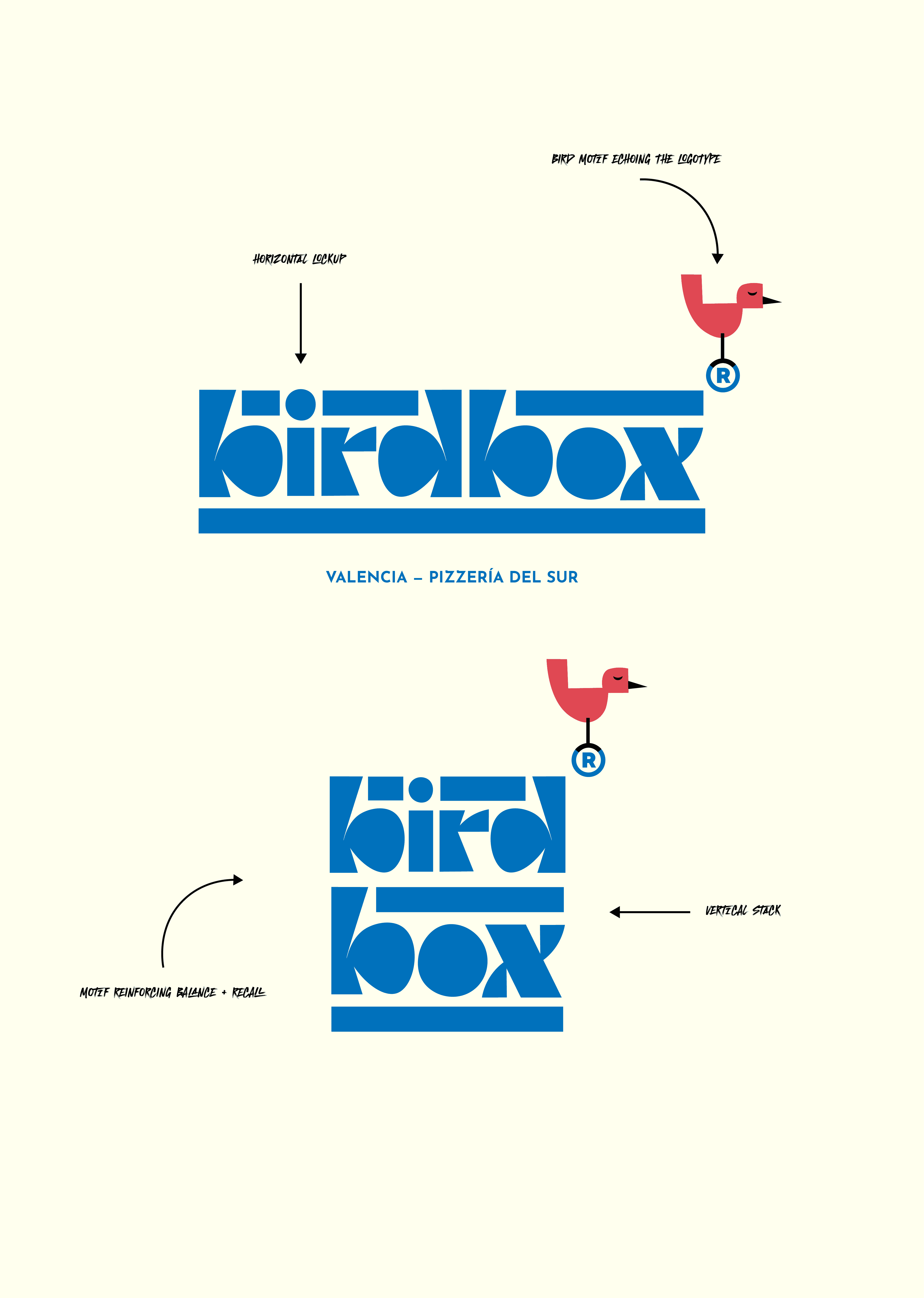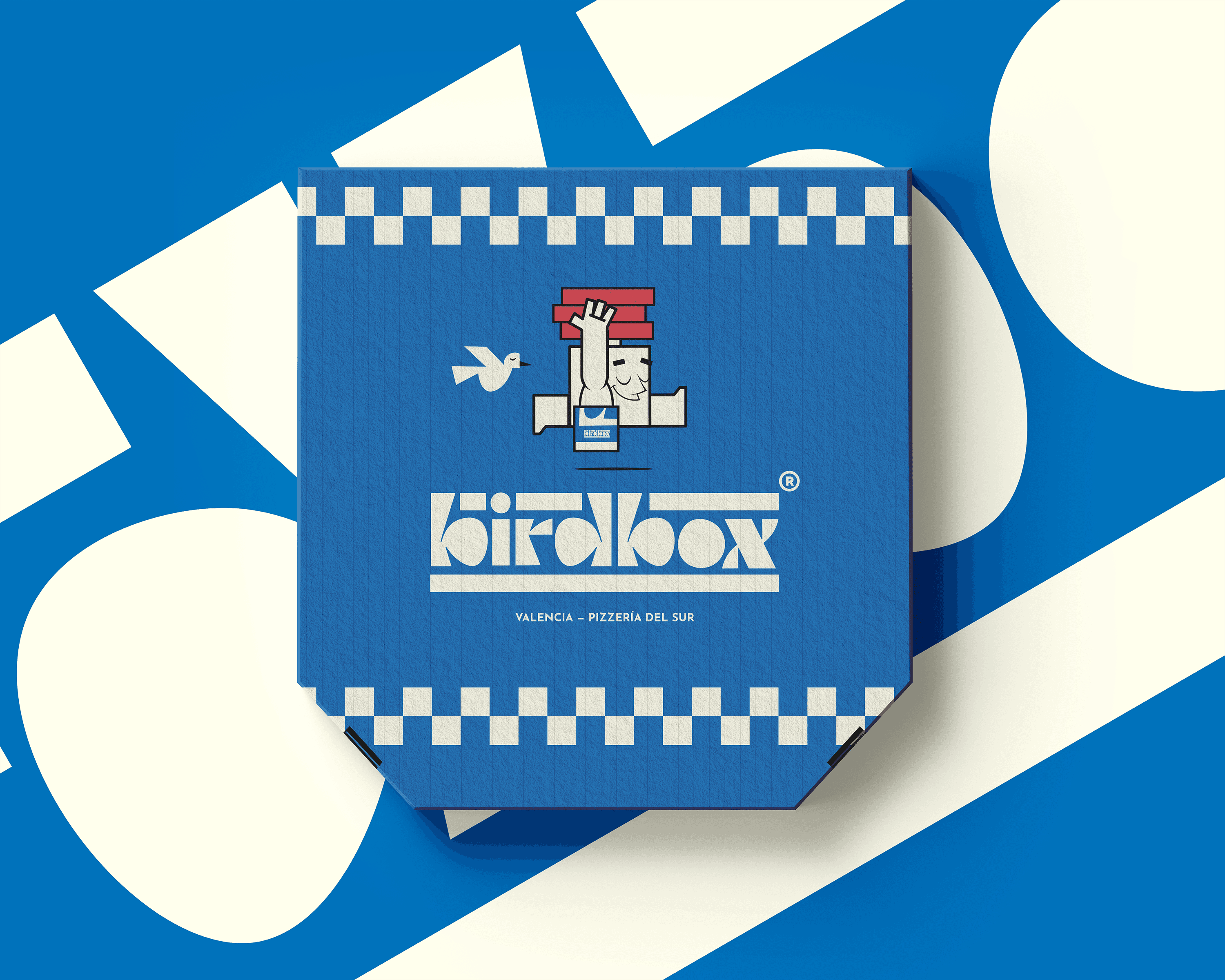 A playful yet precision-built identity for a modern pizzeria. The system balances geometric clarity with character-led warmth, featuring a hand-lettered modular logotype built from repeating forms and a mid-century inspired mascot — a walking pizza box whose red bird counterpart adds motion, energy, and charm. The palette of blue, cream, and red contrasts category norms, giving Birdbox a fresh, coastal attitude that feels both global and local. Every element, from packaging to signage, was designed around rhythm and repetition, echoing the stacking of boxes and the beat of a busy kitchen. The result is a brand that feels designed, not decorated.